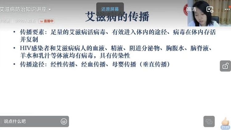 为了提高我校学生对艾滋病的认识,普及艾滋病预防知识,6月24日晚,校医院以“青春自护,知爱防艾——立即行动,向‘零’艾滋迈进”为主题,通过钉钉直播的方式为在校学生开展专题知识讲座。校医院医务人员及4000余名学生在线参加讲座。